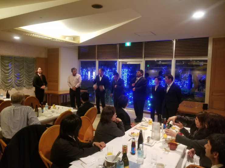 19:30からの忘年会は、代表取締役の会長と社長の御二方からの激励の言葉で開会し、各部署挨拶を行い、バイキング形式のおいしいディナーとお酒を楽しみました。