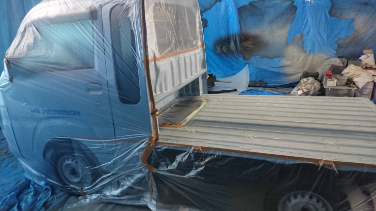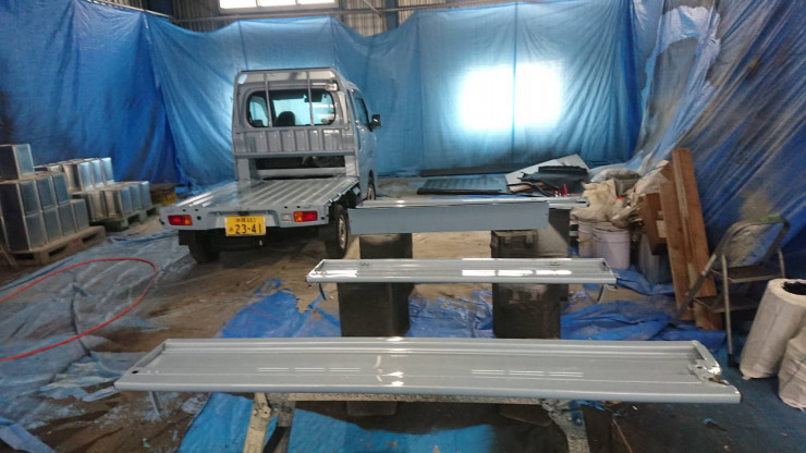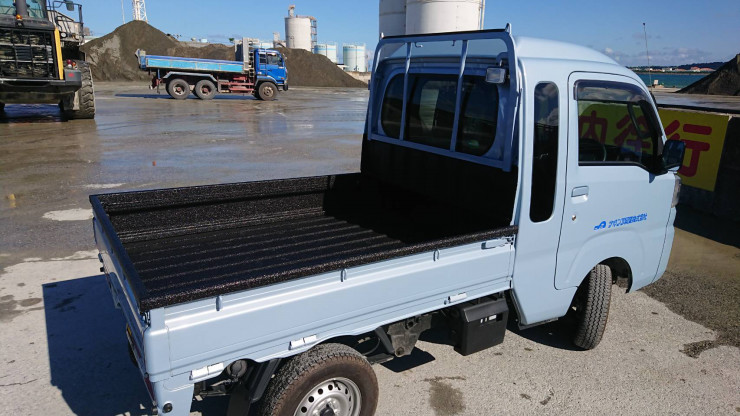 自社ブースにて、最強の防護剤と言われているポリウレアを軽トラックの荷台部分に施工しました。