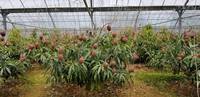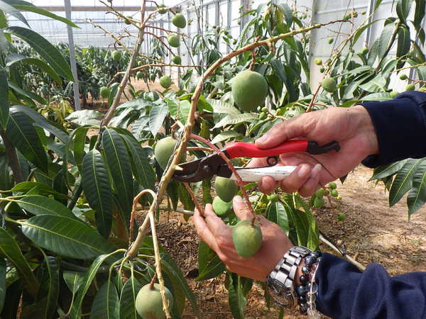 収穫前の作業として、マンゴーの実を太陽光によくあてるために、実を吊り上げます。