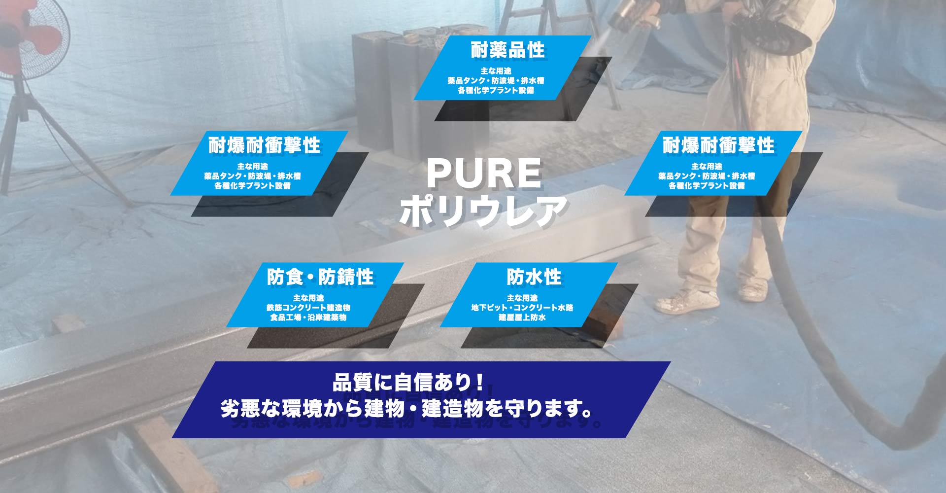 また、最大の特性として「引張強度」「伸び率」など強靭な特性がある事からピュアポリウレアはアメリカやドイツの技術者から『100年コーティング』と称される樹脂塗料です。